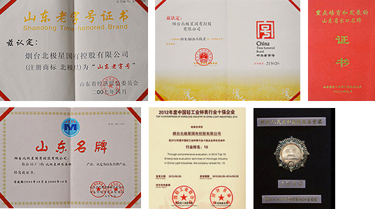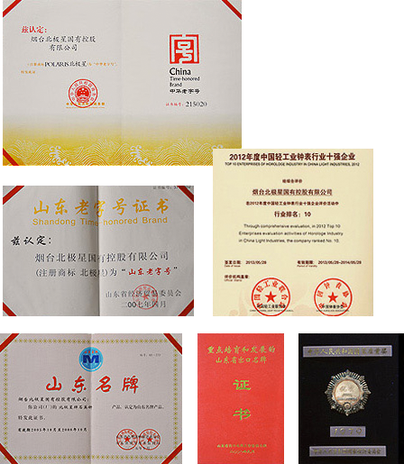 2013年北極星被中國(guó)輕工業(yè)聯(lián)合會(huì)授予年度“鐘表行業(yè)十強(qiáng)”,在此之前企業(yè)先后獲得中國(guó)首批十大“馳名商標(biāo)”、“中國(guó)名牌產(chǎn)品”、“商務(wù)部重點(diǎn)培育和發(fā)展的出口名牌”、“山東老字號(hào)”、“國(guó)家優(yōu)質(zhì)獎(jiǎng)”等一些列榮譽(yù)稱號(hào)。