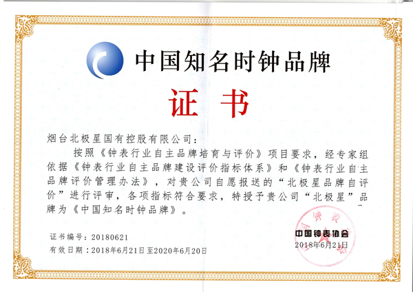 2019年6月21日,在在中國(guó)鐘表協(xié)會(huì)第八屆七次常務(wù)理事會(huì)上,煙臺(tái)北極星國(guó)有控股有限公司榮獲“中國(guó)輕工業(yè)鐘表行業(yè)十強(qiáng)企業(yè)”和“中國(guó)知名時(shí)鐘品牌”兩項(xiàng)榮譽(yù)。